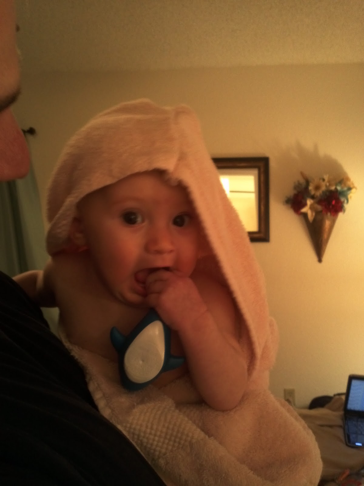 | Post-Bath time snuggle, with Sharkie and Daddy |